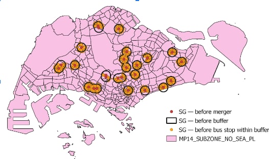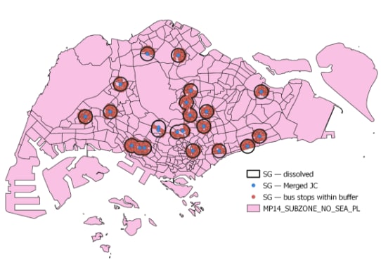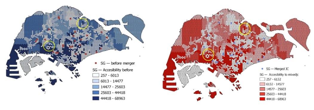 As seen from the region circled in blue and red, before merger, one of the Junior Colleges does not have that many bus stops within the 1 km buffer region as compared to the other. As such, the school that has lesser bus stops is being merged together with the one that has a higher number of bus stops within the buffer region. This could possibly suggest that the merger of schools has allowed schools to be more accessible as compared to before.