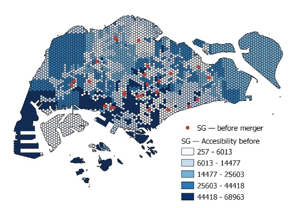 Comparing both hexagons, we have identified the following differences. Few hexagons, only 7, in 2019 before merger are of a darker shade as compared after merger. Also, the closure of those Junior Colleges are mostly within 10 hexagons, which is about 2500 metres apart.