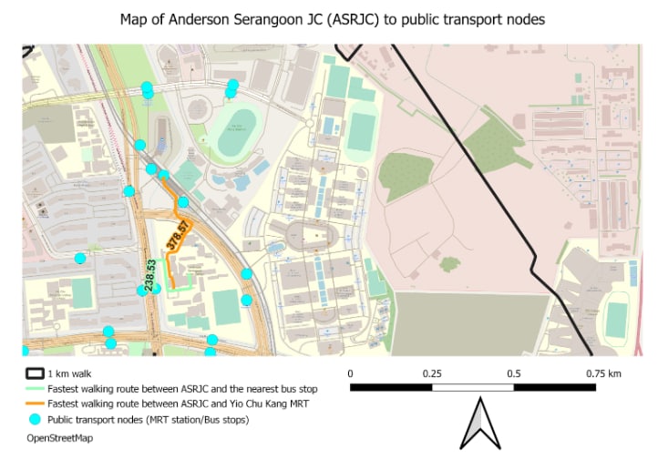 The various walking distances and speeds are further analysed after the merger with all 8 JCs. In no order of merit, they are Tampines Meridian JC (TMJC), Yishun Innova JC (YIJC), Pioneer Jurong JC (JPJC), and Anderson Serangoon JC (ASRJC). The QNEAT routing shortest path plugin has been used to aid our analysis.