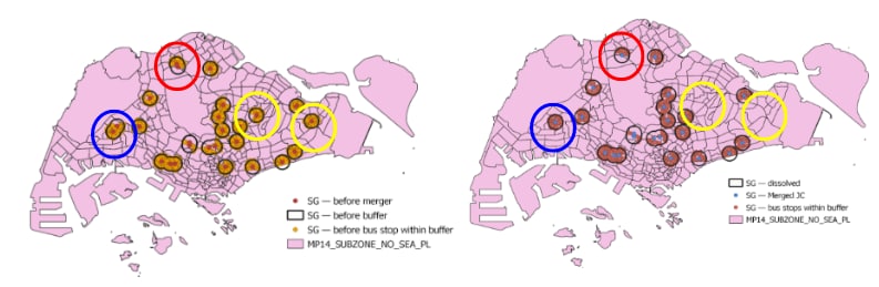 The areas circled in yellow are areas of differences before (on the left) and after merger (on the right). We would be discussing only 2 of those areas (those circled in blue and red) since their 1 km buffer regions are overlapped.