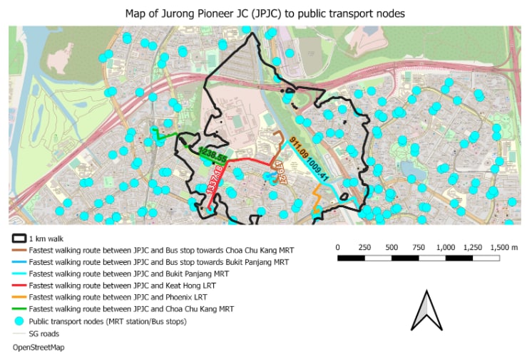 In the west, the two JCs merged were Jurong JC and Pioneer JC, with the final location of Pioneer JC, situated near Bukit Panjang. From the analysis from the print layout above, it seems that the JC is not near any MRT stations, noting that the walking distance to the two nearest stations - Choa Chu Kang MRT and Bukit Panjang MRT is approximately 1.23 kilometres and 1 kilometre respectively. Unfortunately, walking distance to the LRT stations aren’t much better, as Keat Hong LRT station is a whopping 1.33 kilometres from the school and Phoenix is about 911 metres away. Therefore, if a student does not want to walk the humongous distance to the subway networks, there are bus stops situated quite far away as the nearest is about 479 metres away from the JC. With the students coming from different parts of the west, the accessibility here may need to be reviewed and hopefully improved.