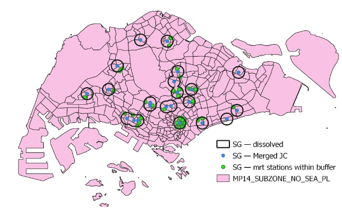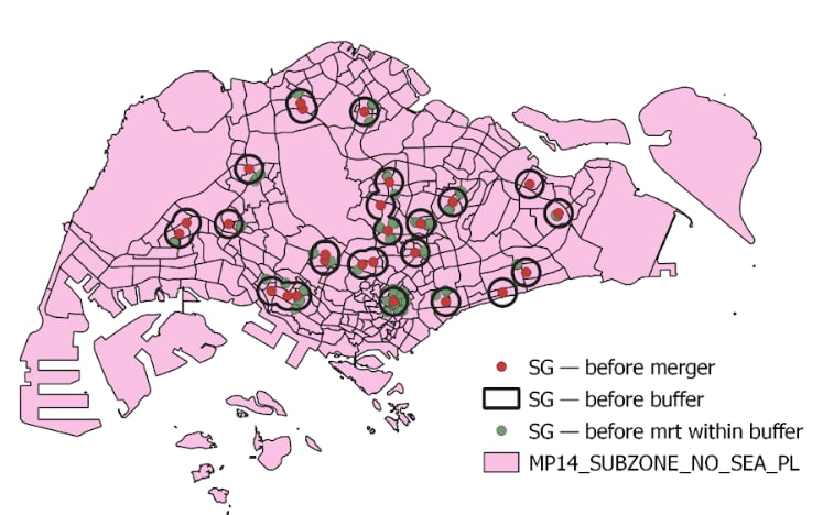 Comparing both figures, the area circled in blue suggests that the Junior College that does not MRT within the 1 km buffer region is merged together with another school that has a closer MRT station. However, on the other hand, the regions circled in red seem to show that even if there is a MRT station within the 1 km buffer region, schools are still forced to be merged. This suggests a potential that the reason for certain schools being selected to be closed could be due to other factors such as availability of school resources.