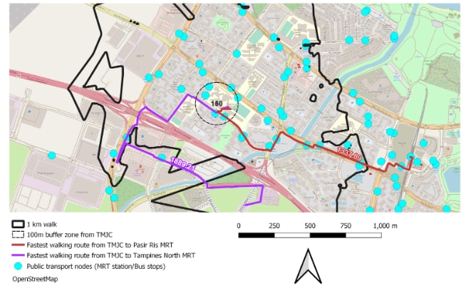 It is noted that with the upcoming Cross-Island MRT line, there is one that may be potentially near TMJC’s vicinity - Tampines North MRT station that is still under construction/planning. However, after a walking-distance analysis, it seems that according to the existing road network, it is still a ludicrous 1.88 kilometres away from the upcoming station. This is likely the infrastructure may not have been developed yet as the station has not been fully constructed yet as the walking routes make many redundant turns according to the prevailing road/path networks. We hope that the accessibility will be improved as there are only bus stops surrounding the JC as we believe many students and staff will benefit from these transport developments.