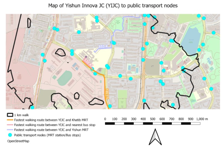 For the location of the newly merged Yishun Innova JC, it seems that the walking distance is closer towards Yishun MRT ( 853.4 metres ) than to Khatib MRT ( 1.007 kilometres ) as the walking route cuts through a park. It is notable that there are also a pair of bus stops to complement the transport network. The nearest bus stop is in front of the JC with a mere distance of 132.41 metres only where trunk/feeder services can be utilised by students and staff. Students do not have to walk far unlike JPJC.